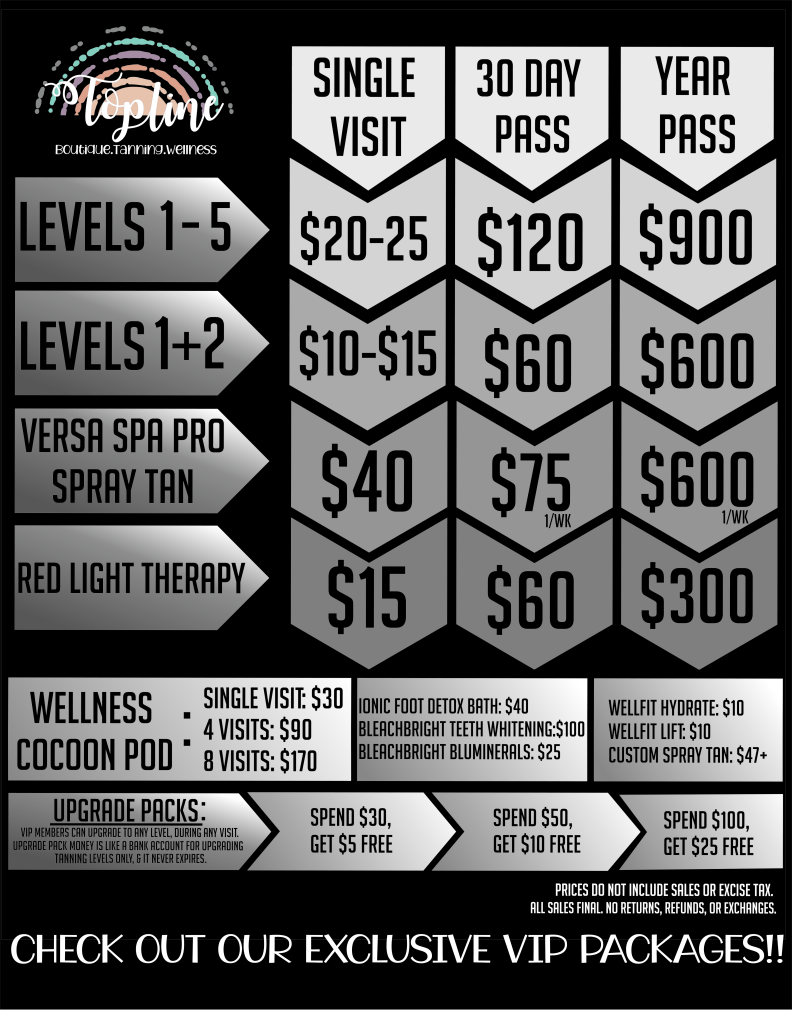 Our most popular VIP is the diamond package as it includes ALL levels of UV tanning and also RLT. The Topline VIP is great for someone who is looking to maximize their experience with ALL wellness and tanning options and the highest discounts. The bronze VIP is great for a base level bed experience that is budget friendly. Our glow VIP is for spray tanners and red-light therapy only.